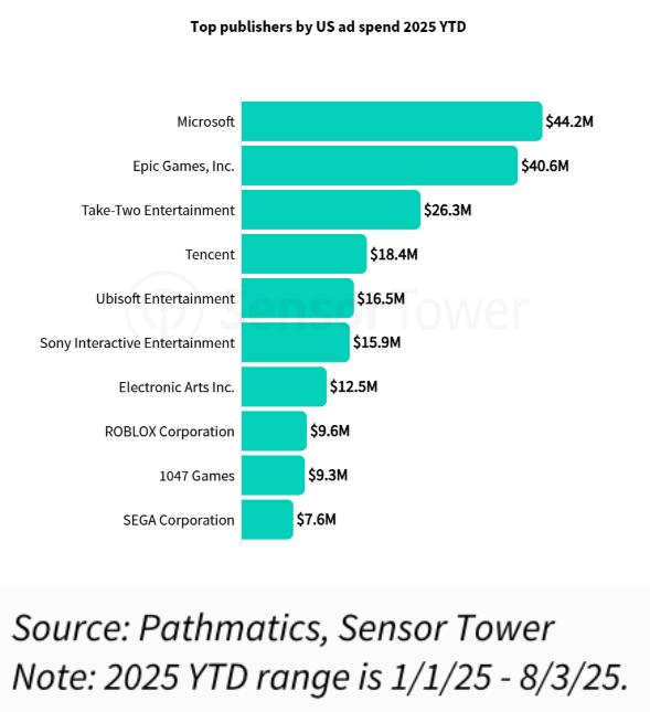 有趣的是,部分销量领先的发行商在广告支出榜单中的排名相对靠后。例如,虽然EA旗下体育系列作品销量极高,但其在广告宣传投入上却较为克制——显然,对于《EA SPORTS FC》等这类成熟的系列作品,无需过多的广告即可触达并激活目标受众。