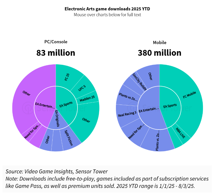 尽管两类平台的下载量不具备直接可比性(移动平台下载量以免费游玩游戏为主),但这一数据仍凸显了EA在移动领域的强大影响力。