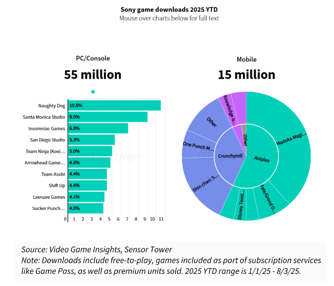 索尼凭借旗下众多优秀工作室和IP,专注于传统PC与主机游戏市场。今年年初至今,索尼游戏总下载量达7000万次,其中PC/主机平台贡献了5500万次,移动平台为1500万次。