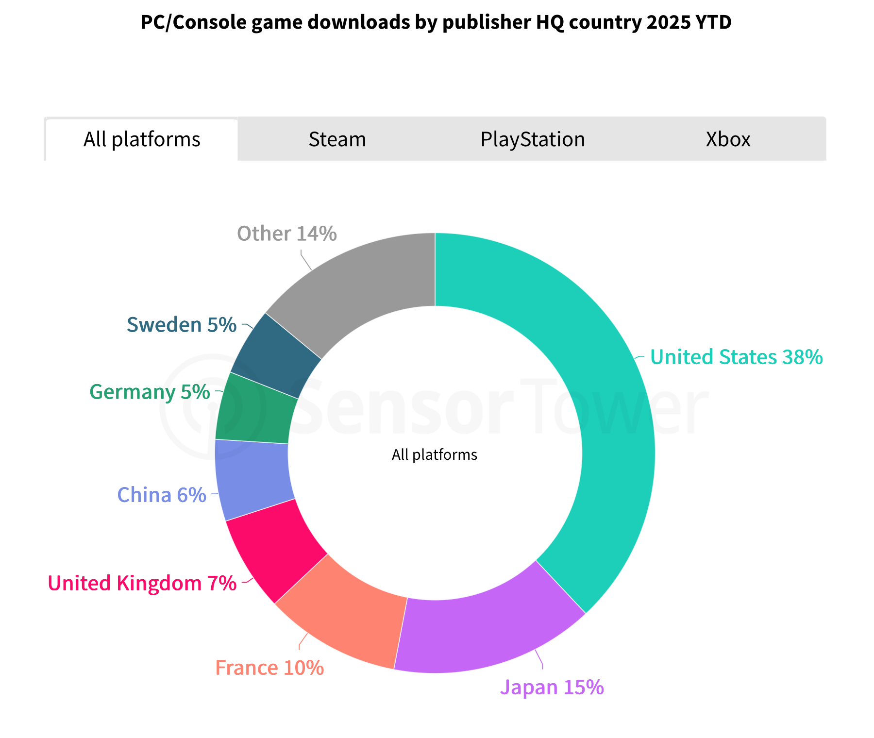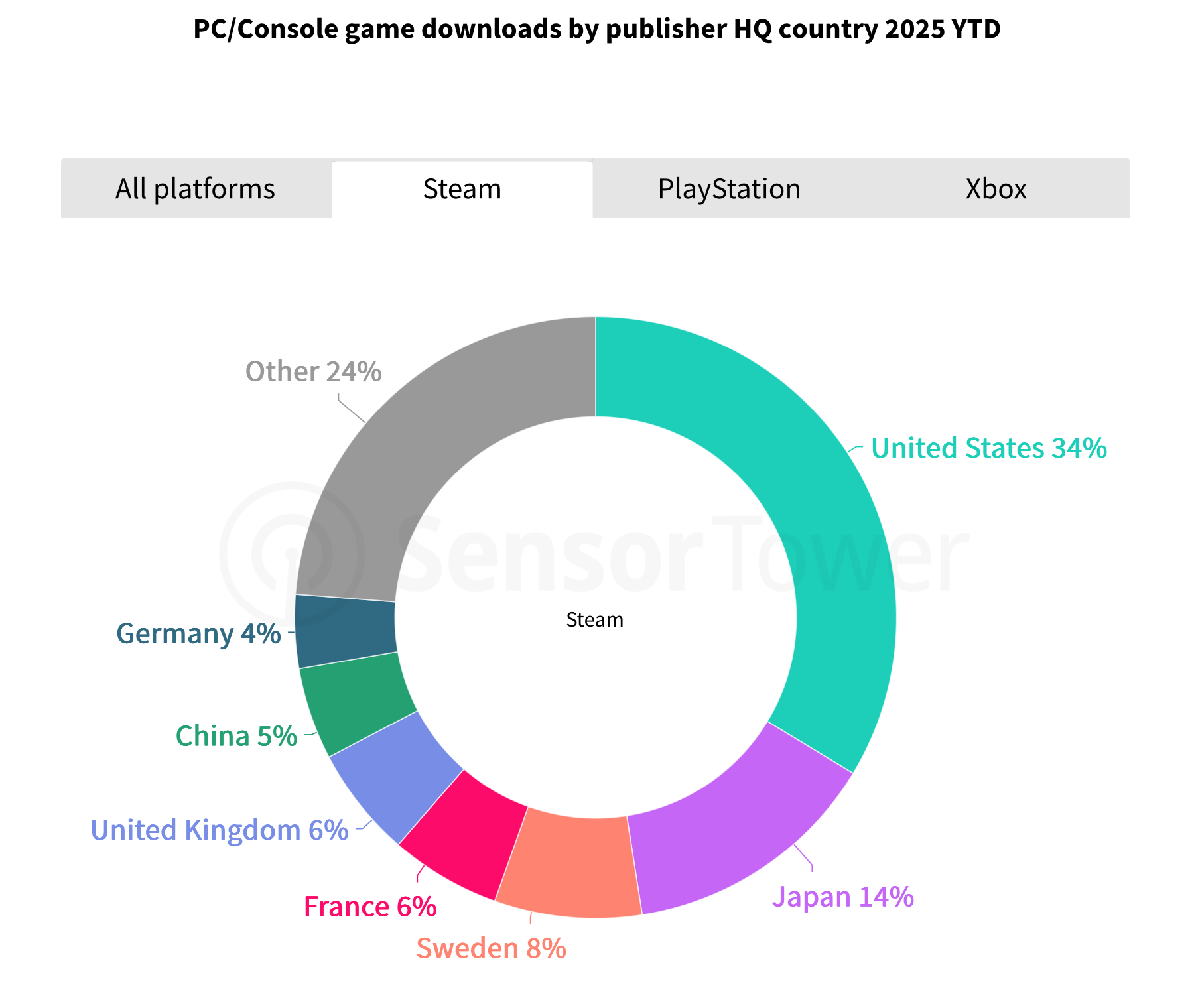 美国发行商在Xbox平台的优势尤为明显,下载量占比超50%,反映了Xbox“以美国市场为核心”的传统战略。相比之下,日本发行商在PlayStation平台的下载量占比达22%,凸显了索尼自身工作室以及与日本大型发行商的合作关系。Steam平台的发行商分布相对多元化,美国和日本发行商的合计占比为48%。