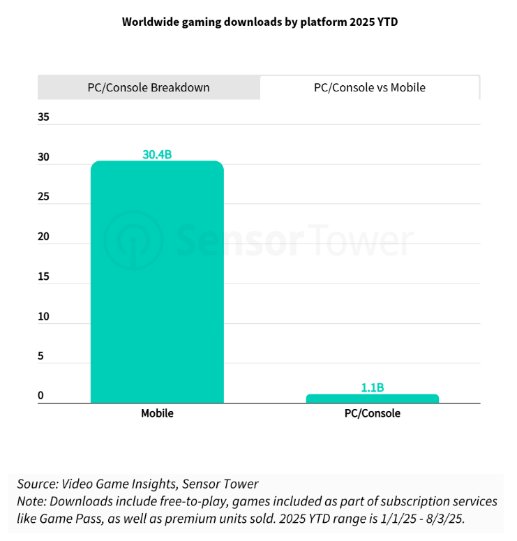 (PC/主机与移动平台游戏下载量对比)