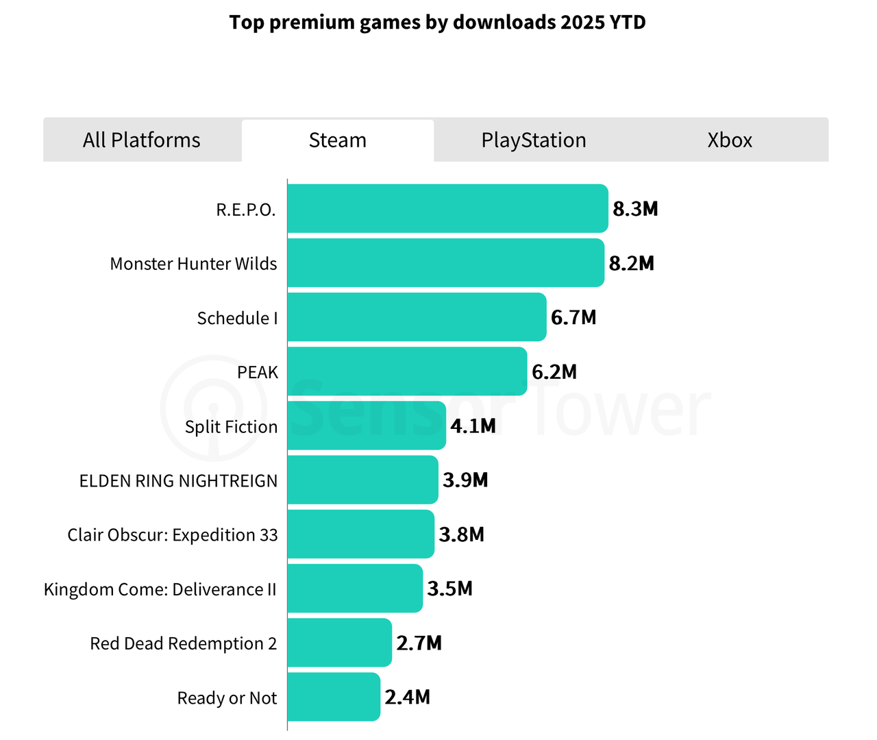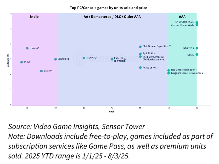 虽然《EA SPORTS FC 25》登顶销量榜榜首,但2025年同样是中体量(AA)和独立游戏的爆发之年,例如《光与影:33号远征队》和《R.E.P.O.》。