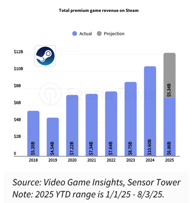 去年,在优质付费游戏的推动下,Steam的营收创下了历史新高,突破100亿美元。2025年年初至今(8月3日),Steam在同一营收指标上相较于2024年同期增长了15%。按照这个速度来看,今年Steam的游戏营收将会突破120亿美元(超过人民币850亿)。