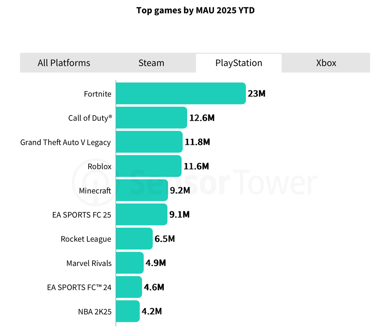 从游戏的月活跃用户数(MAU)来看,玩家对持续运营类经典游戏的参与度仍居高不下。(注:数据不包含通过Steam、Xbox、PlayStation以外平台及启动器游玩的玩家)