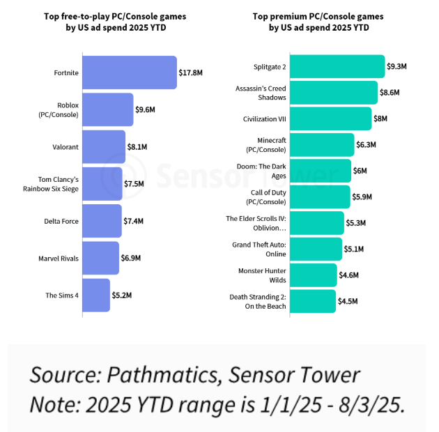 广告支出方面,以美国市场为例,2025年至今PC/主机平台广告支出最高的免费游戏是《堡垒之夜》,其广告支出几乎是排名第二的《Roblox》的两倍。广告支出最高的三款付费游戏均为2025年新发行作品,分别为《Splitgate 2》《刺客信条:影》和《文明7》。