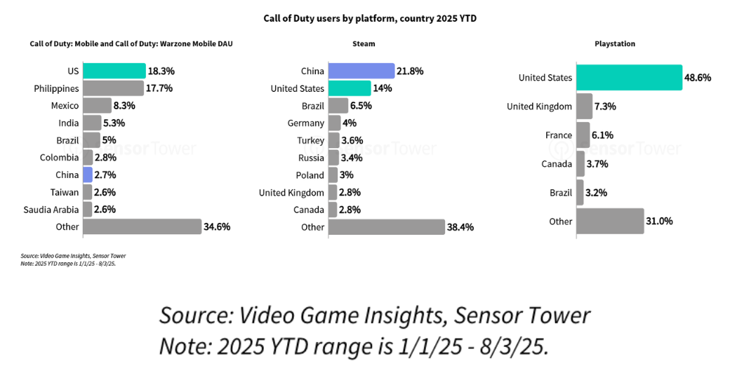 以平台划分,在《使命召唤》的手游版本(包括《使命召唤手游》和《使命召唤:战争地带手游》)和PlayStation版本的活跃用户中,美国均为第一大市场。然而,尽管存在访问性和稳定性问题,但中国仍然是《使命召唤》在Steam上活跃用户最多的国家。