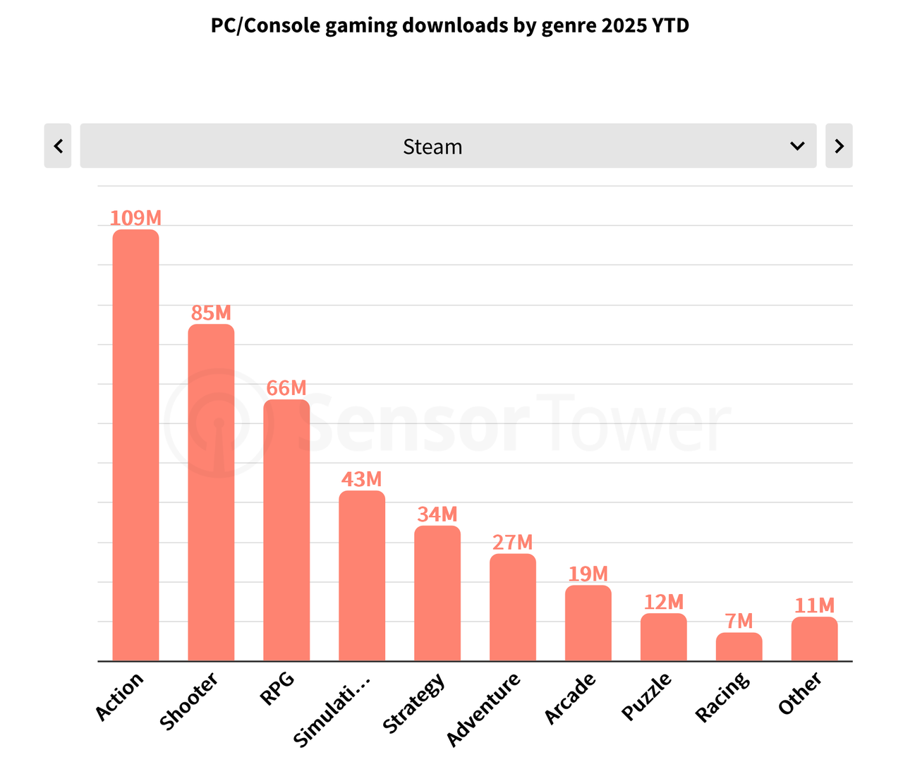 (PC/主机游戏各品类下载量,左右滑动查看)
