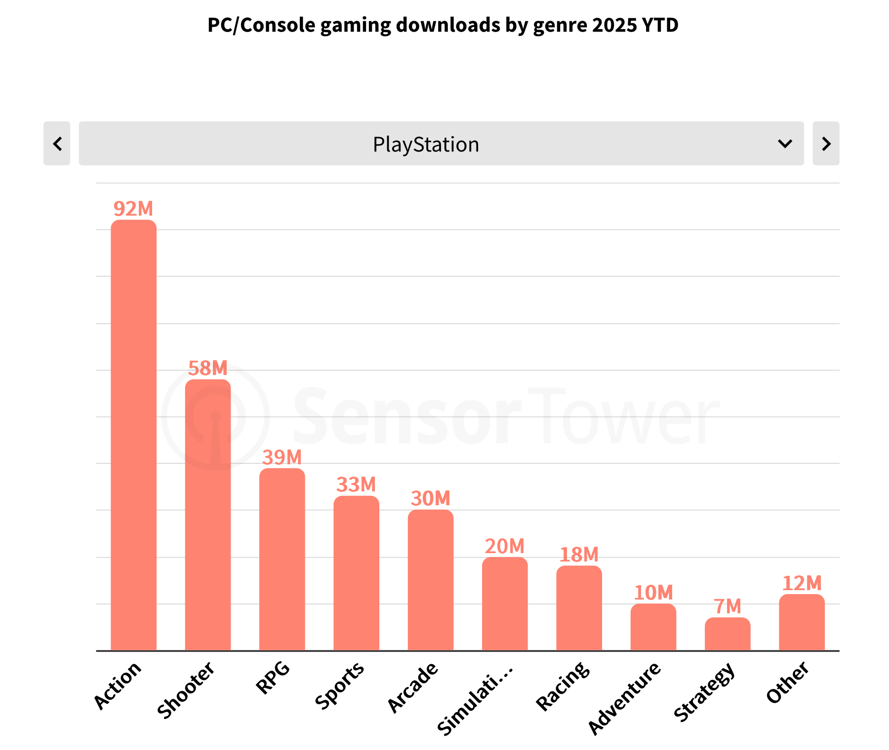 索尼专注于打造重磅电影级叙事驱动型游戏,这一战略在下载量分布中最明显——动作类游戏占其总下载量的54%,这得益于《战神:诸神黄昏》这类长线热门作品,以及《剑星》等新爆款。