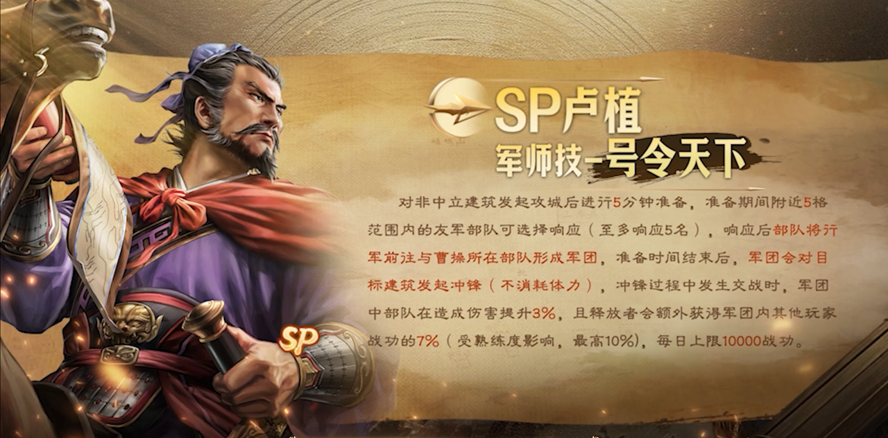 六周年新推出的SP卢植就是一例。在三国早期,卢植是刘备和公孙瓒的老师,也是一位能够著书立说、平定黄巾叛乱的文武双全之人。其技能设计既反映了他作为名儒的才智,又体现了他军事指挥的才能,玩家在用将过程中能自然感受到其人格魅力。