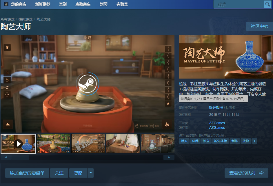 这款游戏叫《陶艺大师》。游戏的玩法很简单,只是让玩家随心所欲创造自己所想要的陶瓷,然后将其展览出去。游戏虽然简单,却很好玩。自2019年发售以来,不断推出DLC,并在steam上有着97%的超高好评率。