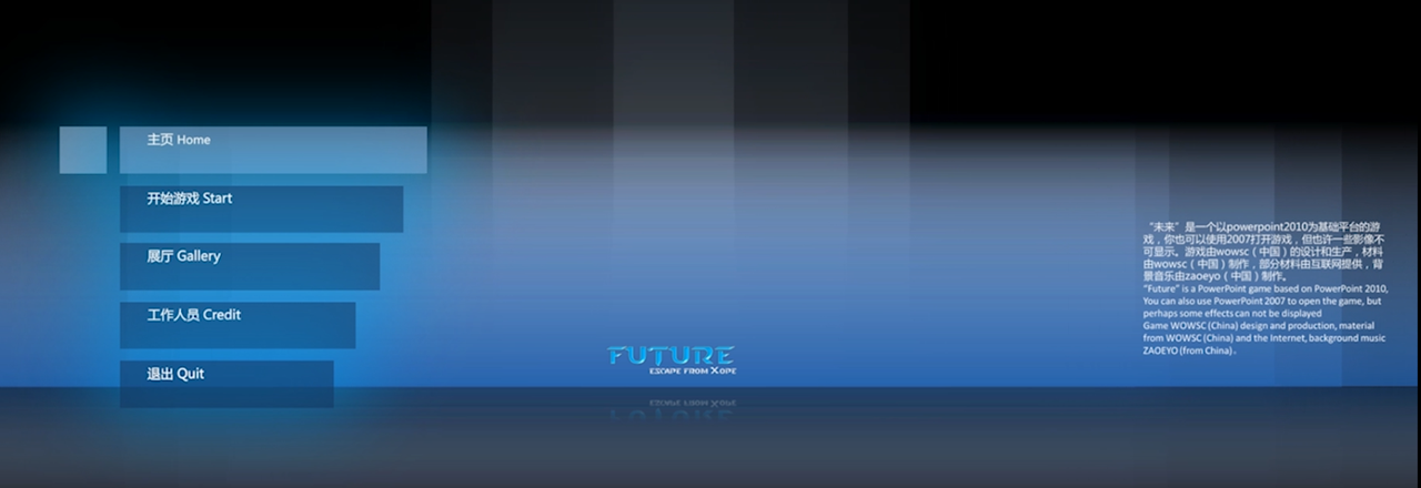 2012年,AZGames还未成立,az以wowsz为名,发布了名为《未来逃离艾克萨普》的PPT游戏,游戏通过庞大的触发器和穷举的方式为玩家讲述了一个略显悲伤的科幻故事,凭借精良的制作和优秀的音乐一时间获得了不少好评,因为年代久远,现在已经很难找到游戏本体。