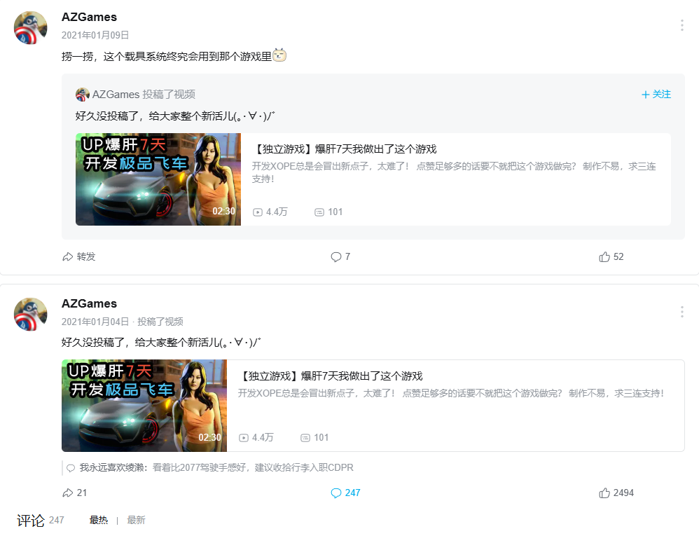 据团队所说,在为《XOPE》开发载具系统时,做出了当时认为效果理想的系统,而az本人又非常喜欢竞速类游戏,再加之az本就有意愿将这个载具系统独立出来,于是,玩家们在这条动态下远超以往的点赞量成为了最后一块拼图。