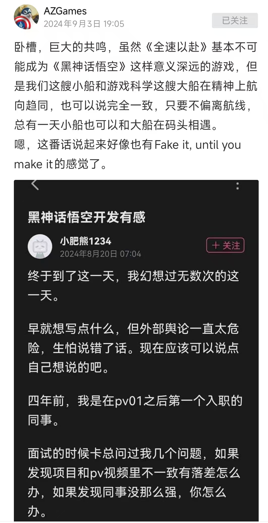 AZGames转发过一篇文章,是一位《黑神话悟空》团队成员对于游戏开发中的痛苦的看法。这份痛苦来源于自认为的无能、来源于和预设目标的渐行渐远。