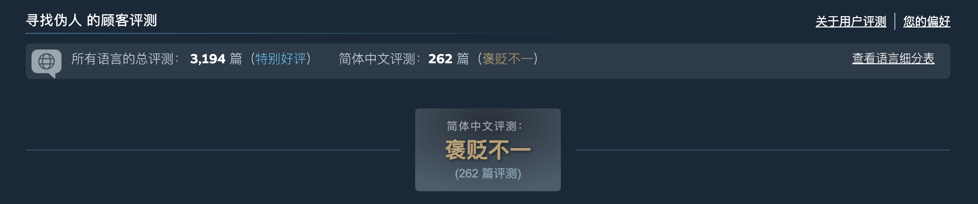 但《寻找伪人》高开低走,后续因为存在游戏Bug、性价比较低等问题,截至发稿前,在Steam上简体中文的好评率仅为67%(所有语言的好评率则为86%)。