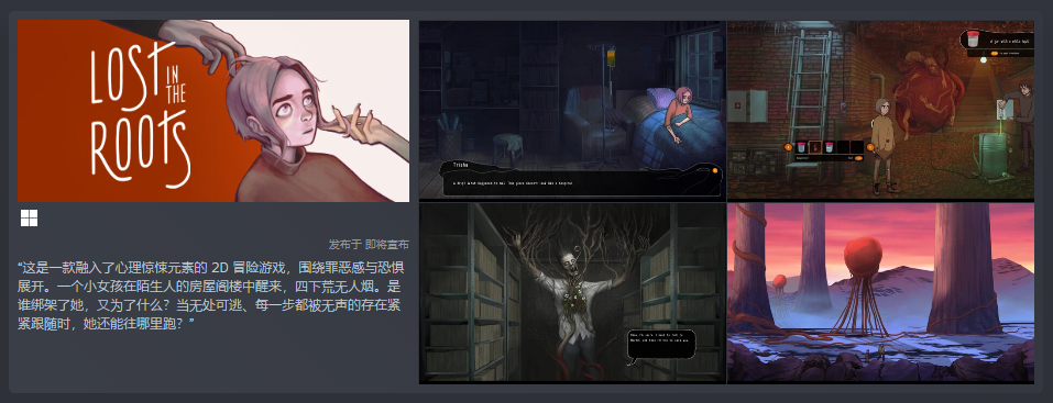 其中,《Lost in the Roots》(迷失之根)是一款融入了心理惊悚元素的2D冒险游戏。游戏讲述了一个小女孩在陌生阁楼醒来后,试图揭开自己被带至此地原因的故事。她需要在一片虚无中寻找出路,同时应对潜伏在阴影中的未知威胁,主题深刻探讨了罪恶感与恐惧。