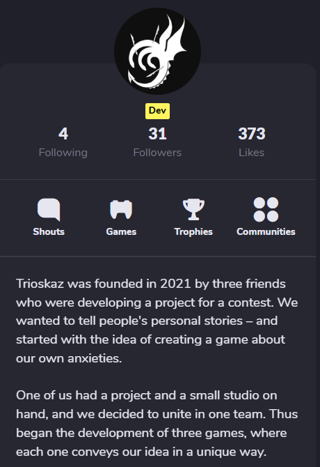 据GameJolt页面所述,三人以朋友关系在2021年成立了Trioskaz制作组。他们的创作理念则是围绕团队成员共同的焦虑点来开发游戏。