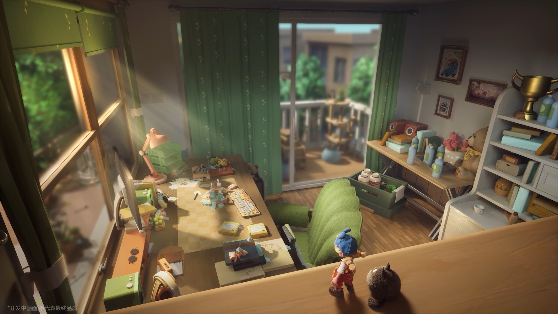 所以,整体风格参考了“类皮克斯”的表达方式。以游戏中的书桌为例,我们采用写实质感的物理渲染来呈现生活真实感,同时在此基础上叠加一层类似“绘本风”的风格化材质渲染,使画面在贴近现实之余又多出一分趣味,呈现出更温暖美好的视觉感受,整个产品强调的调性就是轻松、诙谐、有童趣的生活氛围。