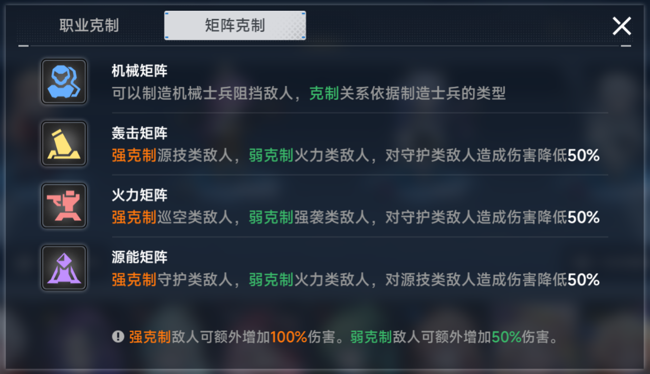 游戏中的防御塔被称为「矩阵」,分为火力、轰击、源能和机械四大类型,玩家需在有限的资源下合理规划矩阵的布局,兼顾战术克制,考验一定的资源管理与统筹能力。在“整备”系统中,玩家可以设置出战矩阵,并对其进行改造与技能升级以提升威力。