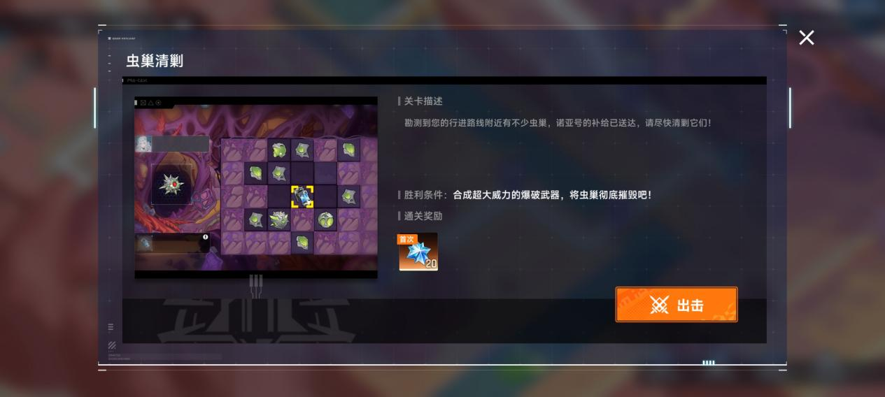 此外,主线关卡的前进路径上还穿插着合成类玩法作为节奏调剂,例如第一章的“虫巢清剿”一关,玩家需要通过合成爆破武器来摧毁虫巢,这样的设计一定程度缓解了“硬核塔防”主玩法带来的枯燥与疲惫感,让玩家在推进过程得到轻松而新鲜的体验。