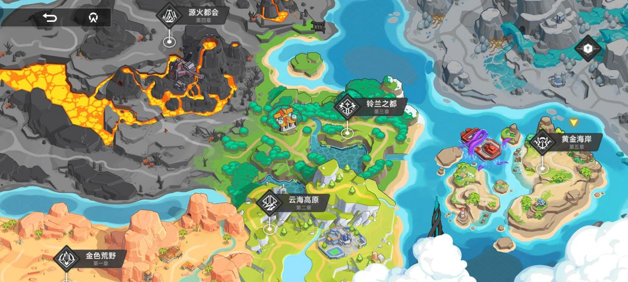 而与角色立绘的精致二次元风形成鲜明对比的,是游戏在场景与界面美术上采用的高饱和度卡通风格。每个关卡中的战斗场景也充满动态细节,而并非静态的“背景板”。例如,在第一章的沙漠地图“金色荒野”中,就能在关卡地图各处看到轰隆作业的采矿机、不停运转的流水线以及烟囱中升腾的黑烟……