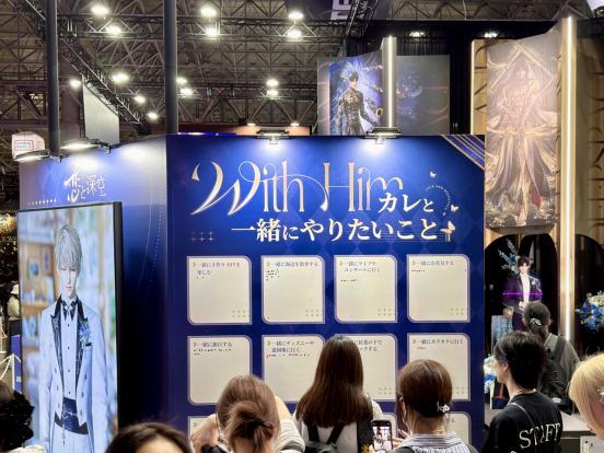 与其它展位相比,叠纸可能不算最华丽的,但在互动性与沉浸式体验上,它绝对是最突出的展位之一。比如《恋与深空》展区前,设置了5位男主角色的tower和电子屏互动,展示的是4.0玩家一致好评的婚卡造型。不论什么时候经过,都能看到大量“猎人小姐”排着长队的身影。