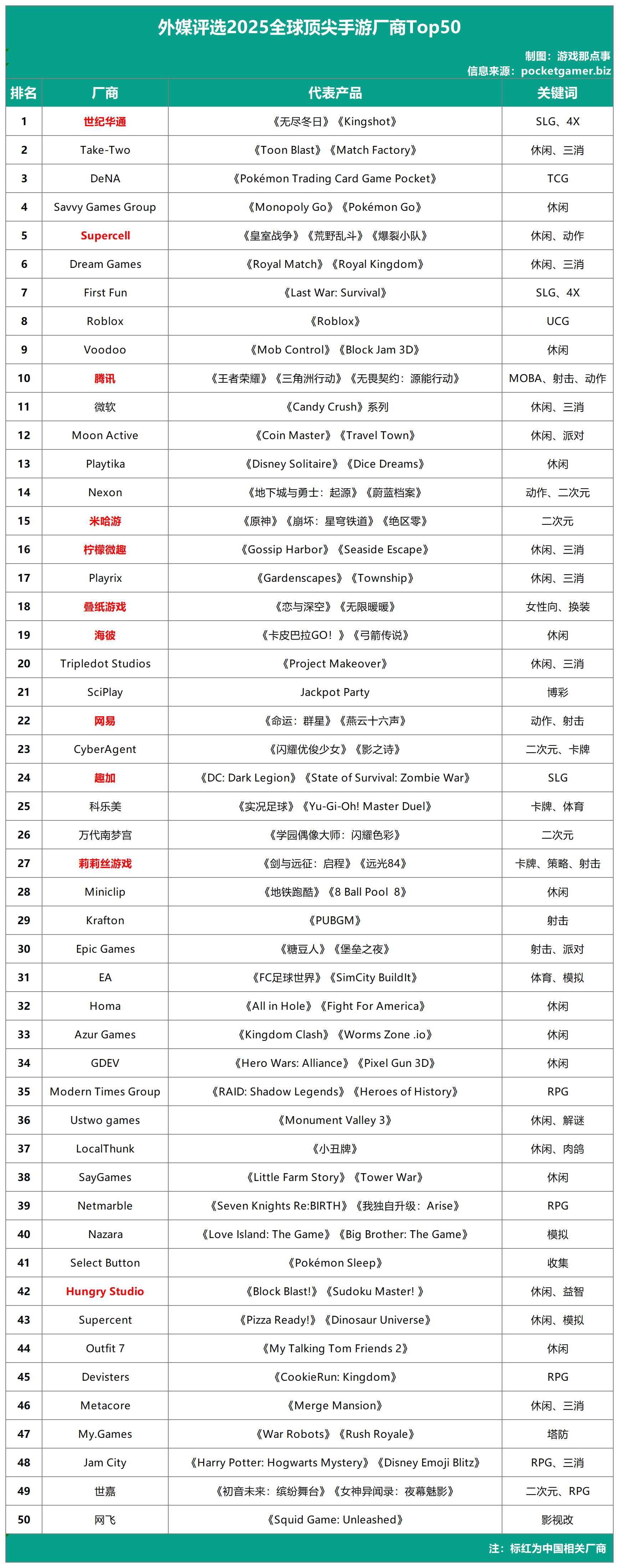 随着国庆假期结束,对于游戏市场来说这个2025年已经迈进了Q4,在这一阶段,外媒pocketgamer.biz对外发布了自己评选的2025全球顶尖手游开发商Top50榜单。