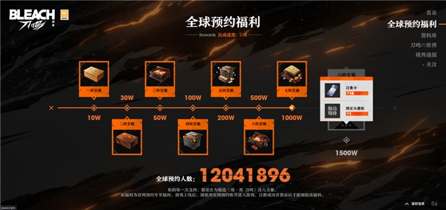 全球预约人数突破1000万!《境·界 刀鸣》特别追加第八档预约福利,静待各位死神代理人解锁——达成1500万预约,全员赠送:「召集令*10 及 纪念头像框」!现在即刻前往预约《境·界 刀鸣》,就能获得SR角色集结邀请函、稀有核心刻印、神秘预约礼盒等超值好礼!