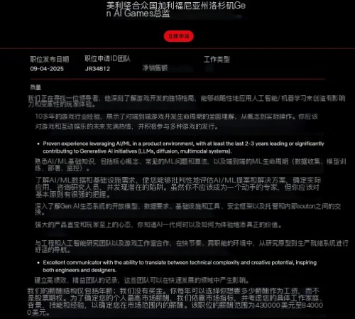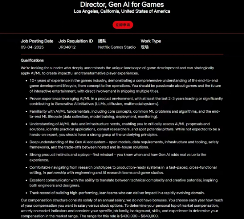 9月4日,网飞在官网发布了一则生成式AI游戏总监的招聘公告,工作地点为美国洛杉矶,开出了43-84万美元(按现汇率约306-599万人民币)的年薪。