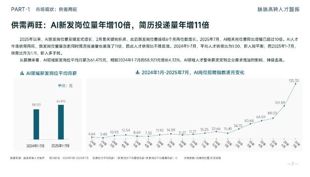 根据翰格集团最近发布的《2024中国人工智能与大数据人才薪酬趋势报告》,人工智能领域的职位数量相比23年年初增长了28%,且存在普遍高薪现象。脉脉高聘人才智库发布的《2025AI人才流动报告》显示,今年上半年AI新发岗位同比增幅超十倍,AI市场供需两旺。
