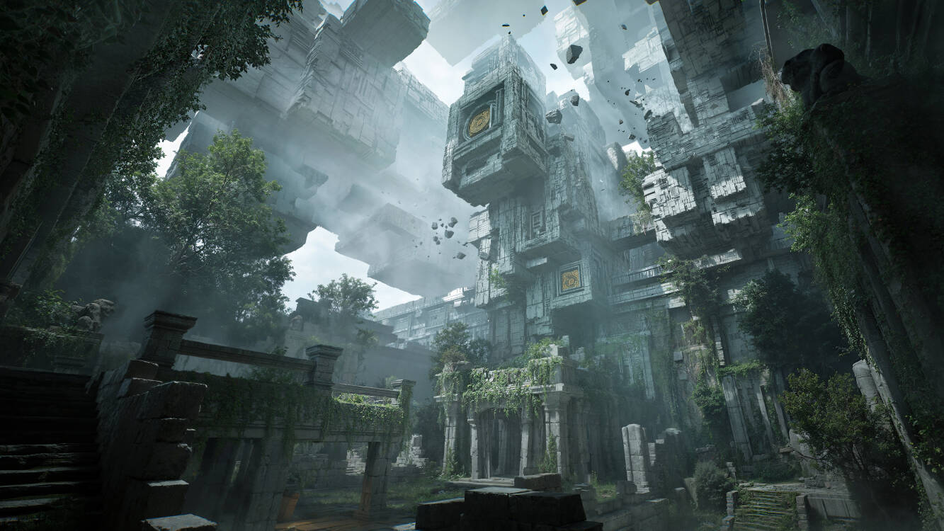 同样的是在PV画面中,我们也能看到,探索小队从阴暗潮湿的废弃神殿逃离出来后,便来到了处于火海的遗迹之地,到处都是迸射的火星与倒塌的建筑,一改前者寂静压抑的氛围,给人带来极强的视觉冲击力。
