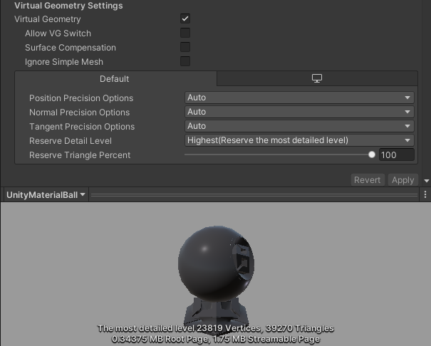 团结引擎1.7.1「preview」版本的虚拟几何体渲染调整界面