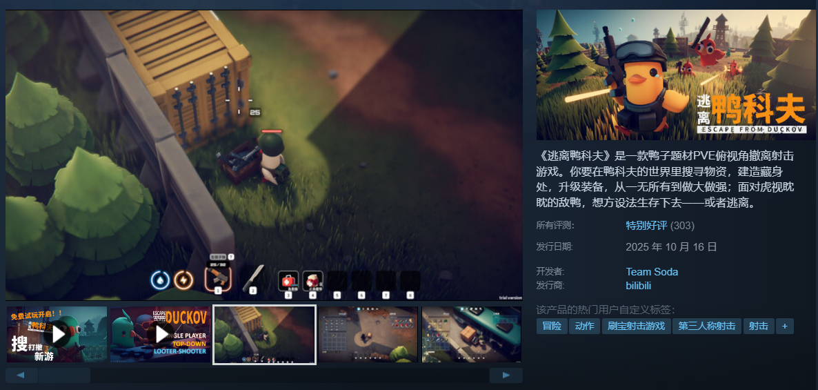 B站另一款产品《逃离鸭科夫》于10月16日发售后,目前已获得了93%的特别好评。该作由B站旗下自研团队“碳酸小队”开发,团队此前曾推出过《碳酸危机》《蛇行武装》这两部在Steam拥有较高好评率的独立游戏。游戏以独特的鸭子题材和俯视角设计为核心,整体对战体验和画面风格都较为轻松诙谐,搭配上丰富的枪械种类、萌趣的角色外观与基建养成内容,以较小的体量打出了鲜明的辨识度。