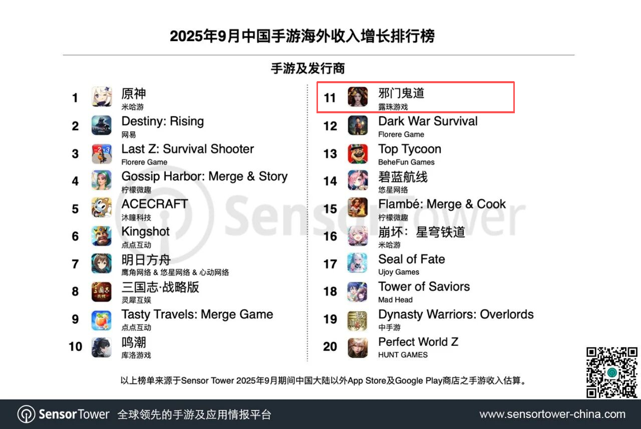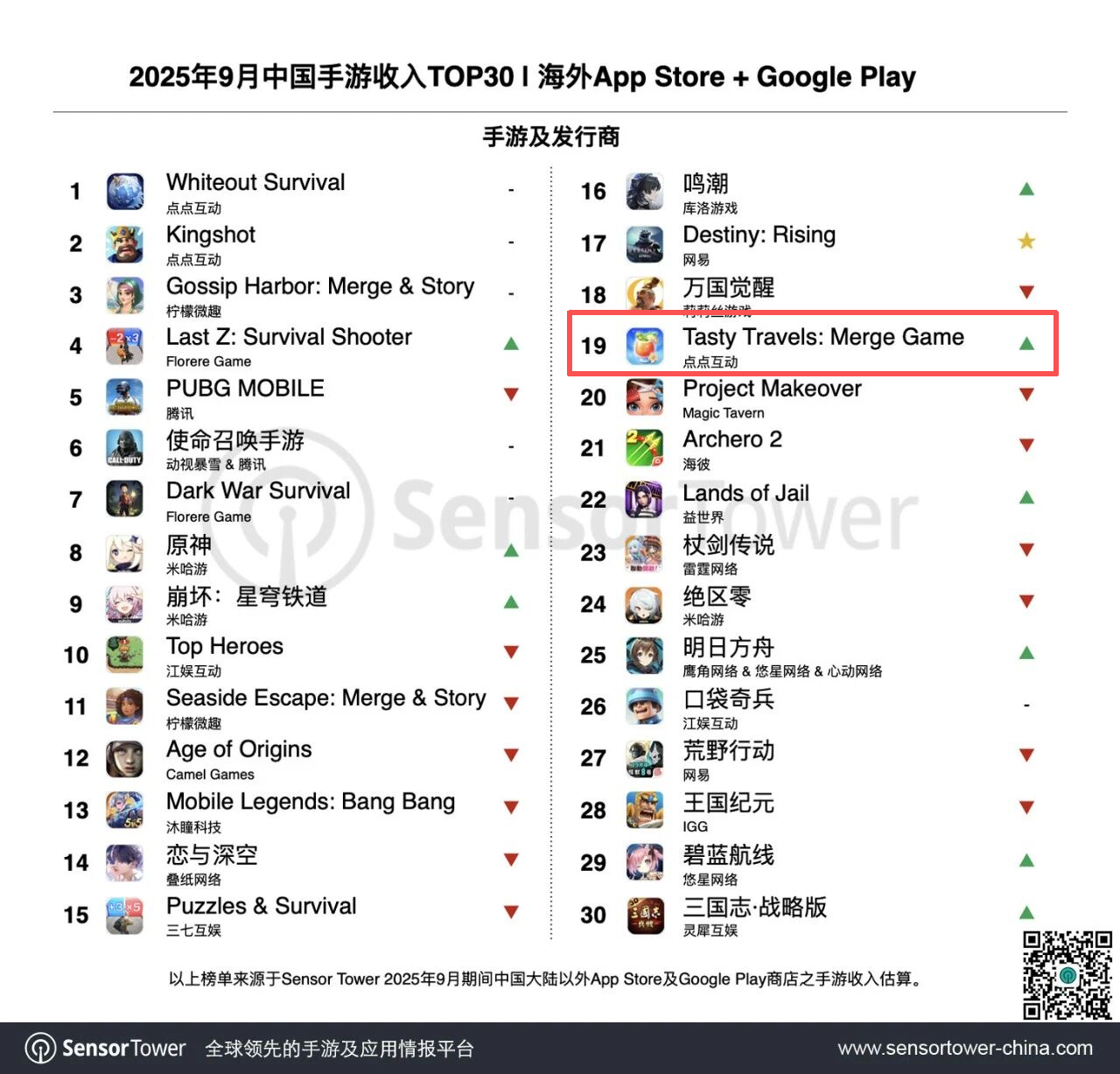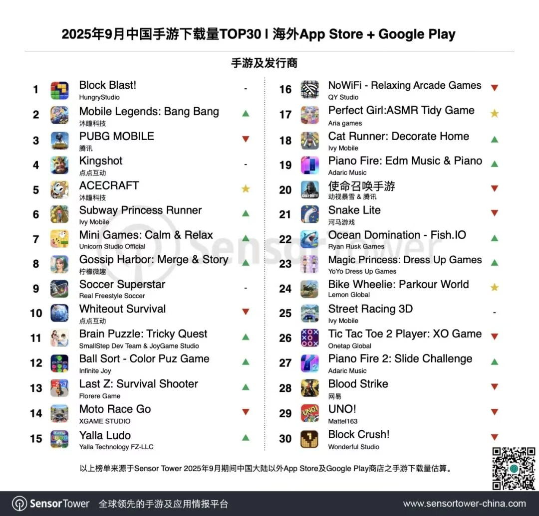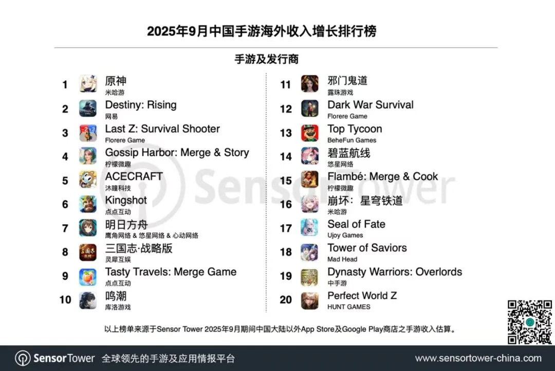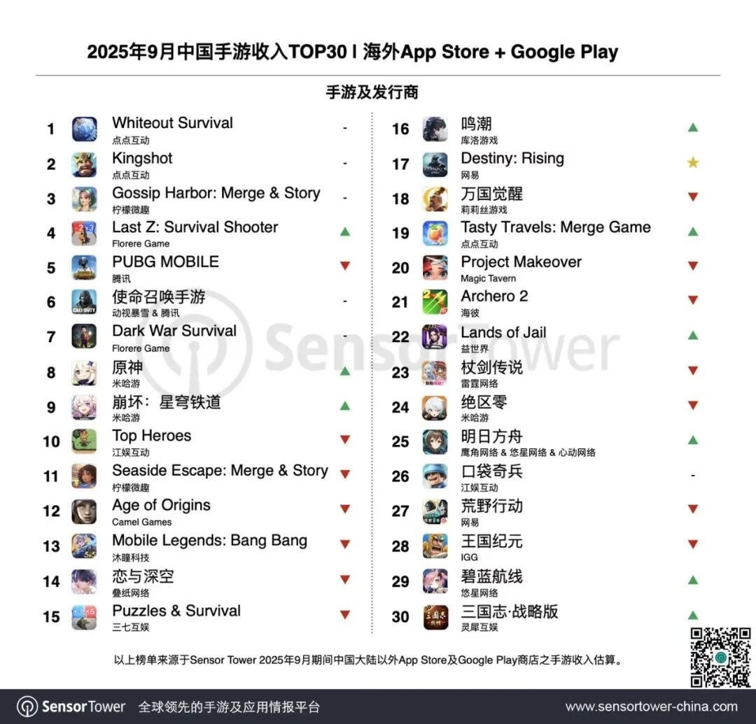 最近,Sensor Tower发布了2025年9月中国手游产品在海外市场收入排行TOP30(以下简称收入榜,仅统计应⽤商店IAP预估值,不包括⼴告变现收⼊和中国地区第三方安卓渠道收入)。