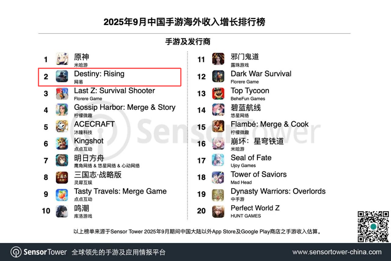 米哈游《原神》本期海外收入激增112%;网易的《Destiny: Rising》(命运:群星)9月收入激增300%,成功入围出海手游收入榜第17名,并跻身增长榜第2名。