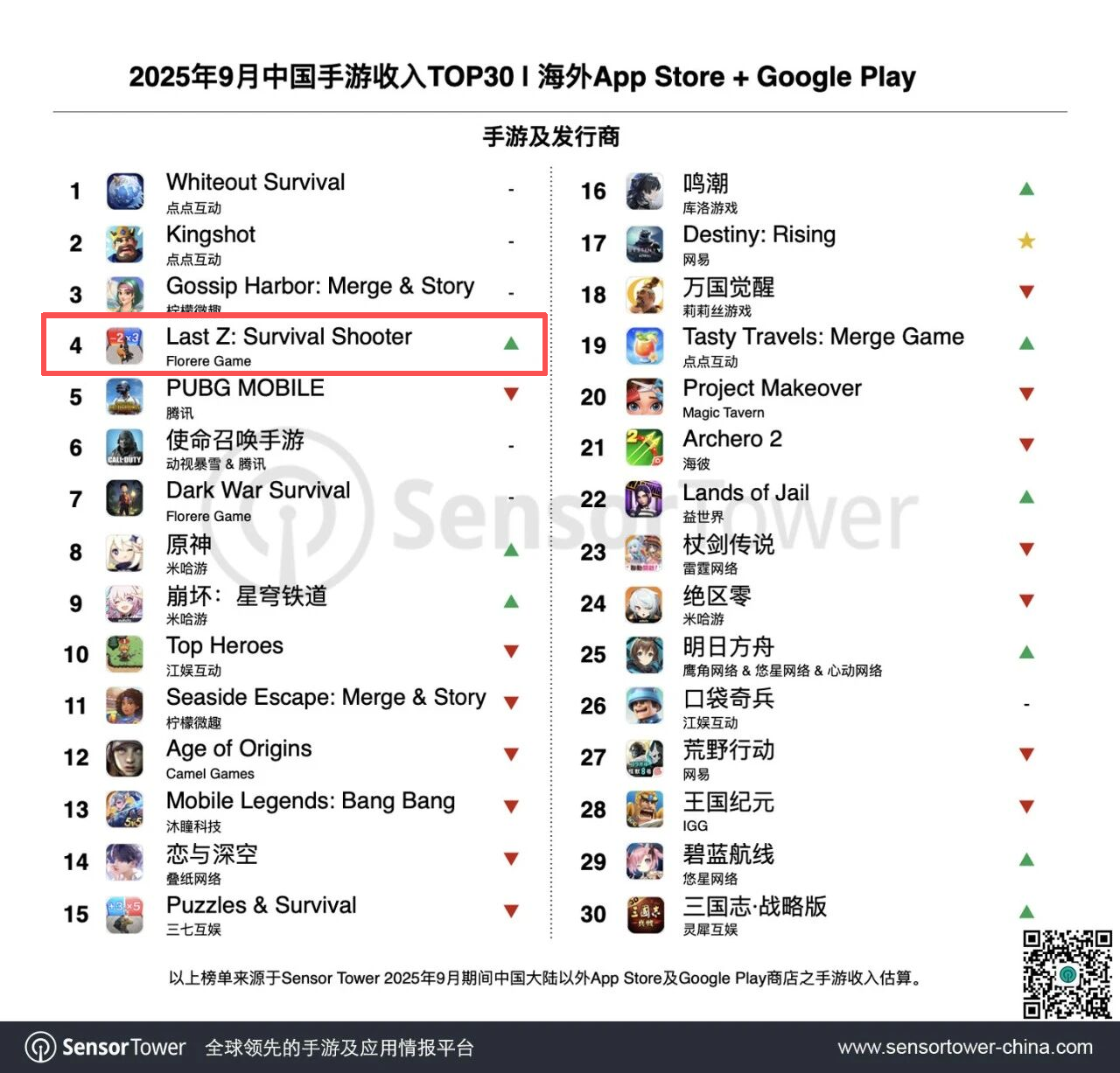旗下《Last Z: Survival Shooter》依旧保持强劲增长,9月收入环比再涨22%,跃居本期出海手游收入榜第4名,再次刷新了自己的排名纪录。