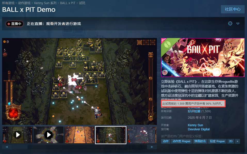 然而,在玩法创新似乎遇到瓶颈之际,2025年6月的Steam新品节上,一款由独立游戏发行商Devolver Digital公布的Demo《Ball x Pit》,在当时以96%的“特别好评”悄然吸引了大量关注,Demo下载量超过16.5万次,被不少玩家和媒体视为有望复兴该品类的潜力之作。