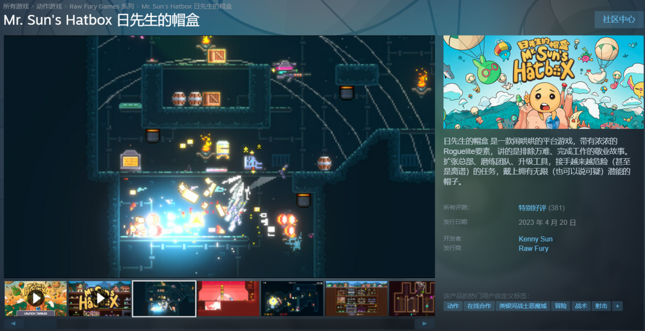 之后,Kenny继续回归个人开发,于2023年推出了轻度Roguelike平台游戏《日先生的帽盒》,尽管是个人主导开发,游戏内容却异常丰富,并且复古像素风格和闹哄哄的关卡设计,依然延续了Kenny自《Circa Infinity》以来对视觉节奏的掌控力,这款游戏在Kenny的个人作品中获得了不错的表现。
