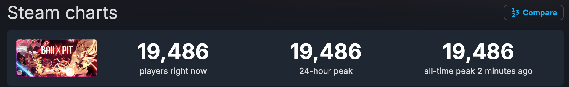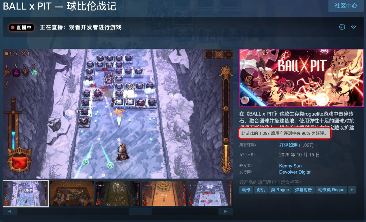 而正式版发售后,《Ball x Pit》的玩家评价依然稳居高位,除了获得1000余玩家给出的96%好评之外,当天游玩人数也达到了上万人次。