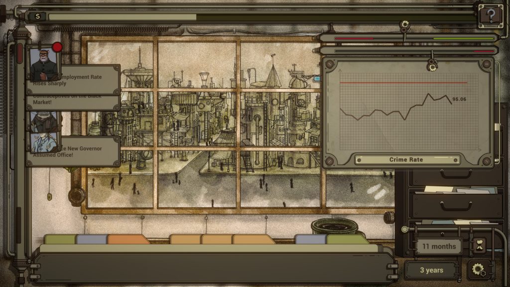 同样以demo形式在Steam平台上进行测试的还有日暮鸟工作室蒸汽朋克风格的模拟游戏《生育、犯罪与经济》。