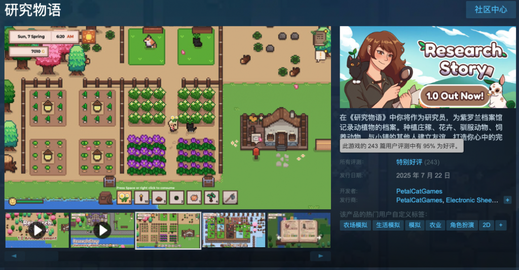 而电子羊工作室则是在今年7月份上线了自己的“种田”新作《研究物语》,目前在Steam平台的243条玩家评价中拿到了95%的好评。