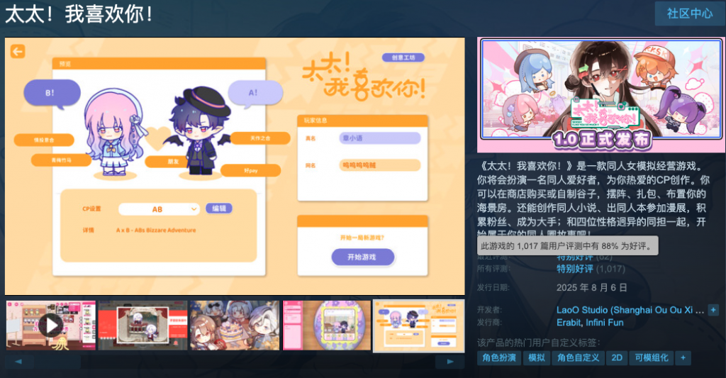 老欧工作室主打“吃谷”和“嗑CP”的《太太!我喜欢你!》正式发售刚满2个月(今年8月份正式发售),在Steam平台上就已经有1017篇用户评测,并且有88%的好评率,有望成为第一个从铼三“毕业”的团队。
