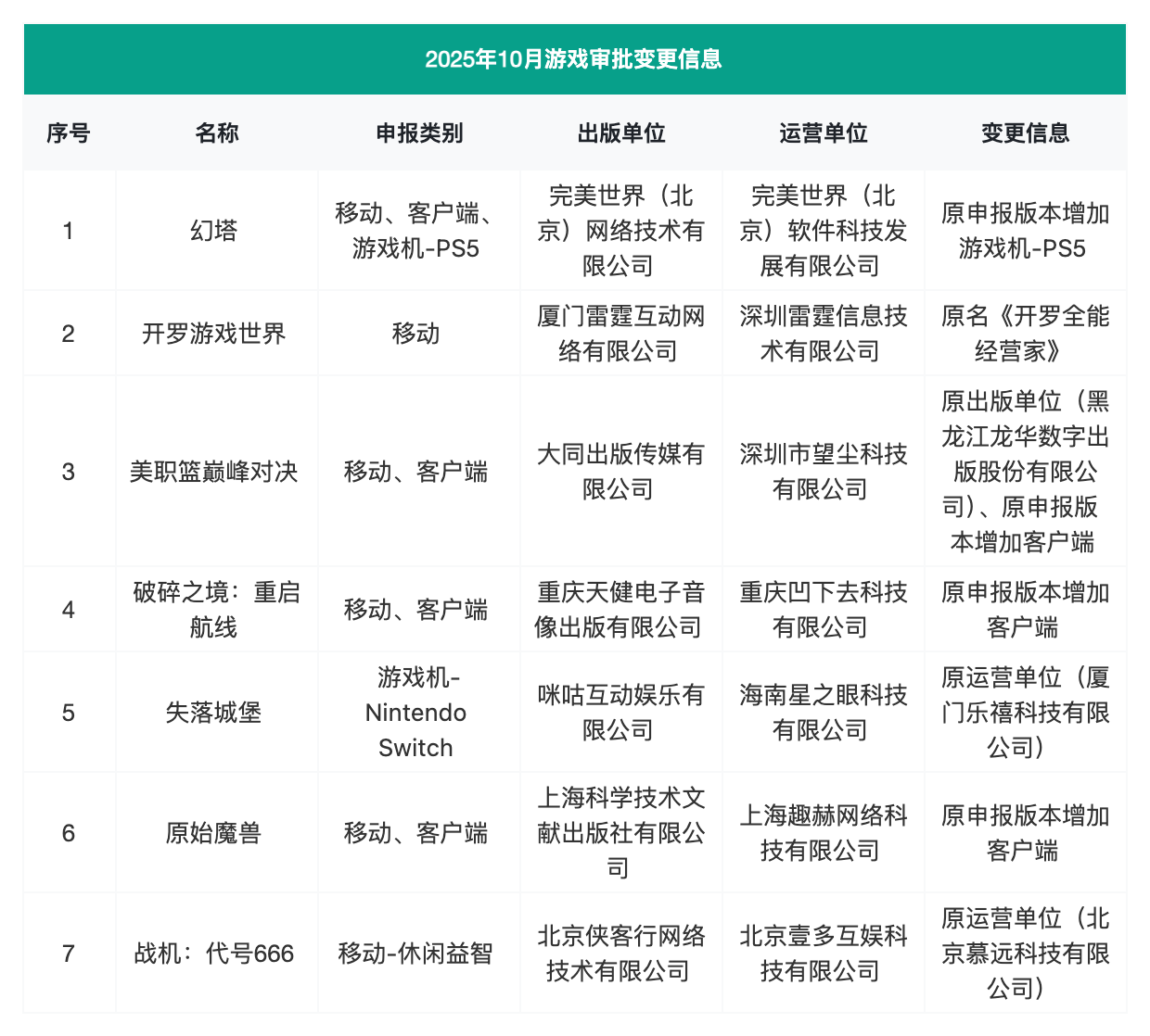 除此之外,今天还有一批国产版号的变更消息。其中,值得注意的是,望尘科技的《美职篮巅峰对决》新增客户端;完美世界《幻塔》增添PS5版本。