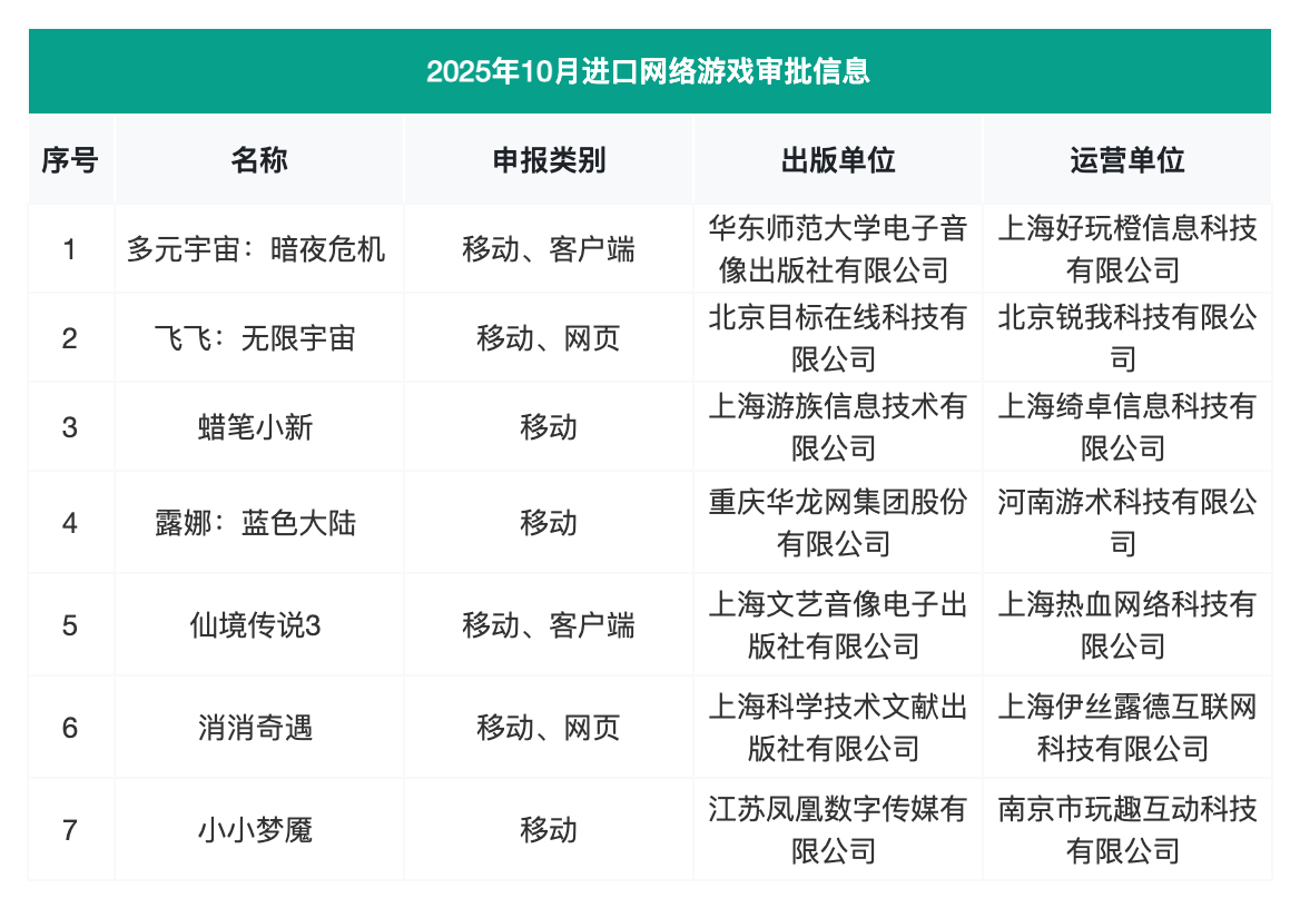 上海好玩橙《多元宇宙:暗夜危机》、北京锐我《飞飞:无限宇宙》、上海绮卓《蜡笔小新》、河南游术《露娜:蓝色大陆》、上海热血网络《仙境传说3》、上海伊丝露德《消消奇遇》、南京市玩趣互动《小小梦魇》。