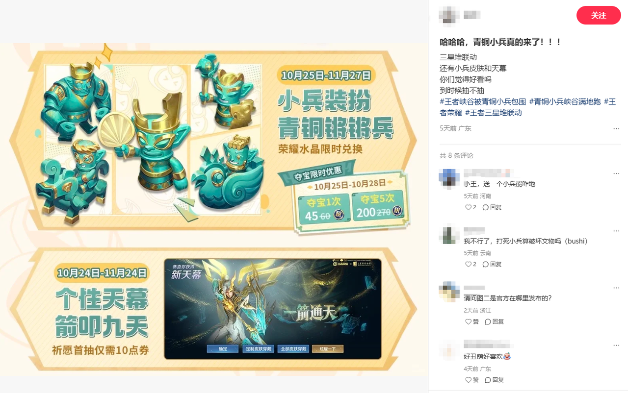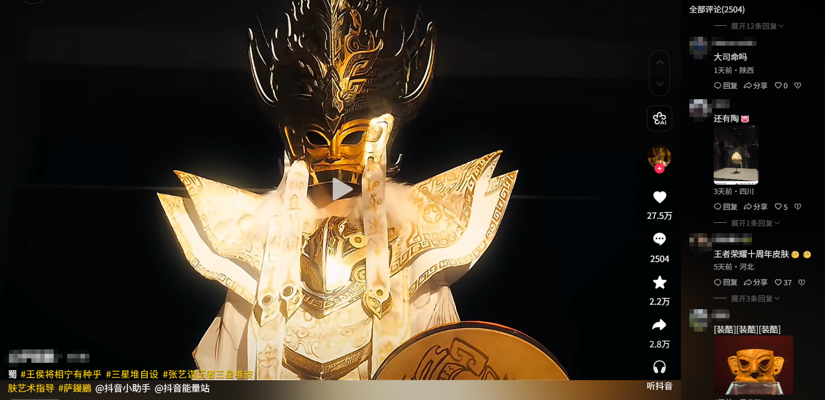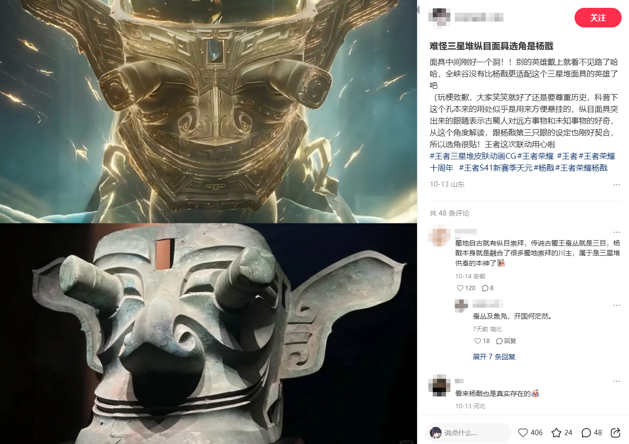 当然,《王者荣耀》和三星堆文化这两张“四川名片”强强联手带来的传播辐射效果远不止于此,在社媒平台上,有热爱研究三星堆文化的玩家趁着这个机会打造了“自设”,评论区也有不少来自四川本地的玩家正在向其他地区的玩家朋友们倾情安利三星堆线下参观体验,成功实现了一次联手“破圈”。