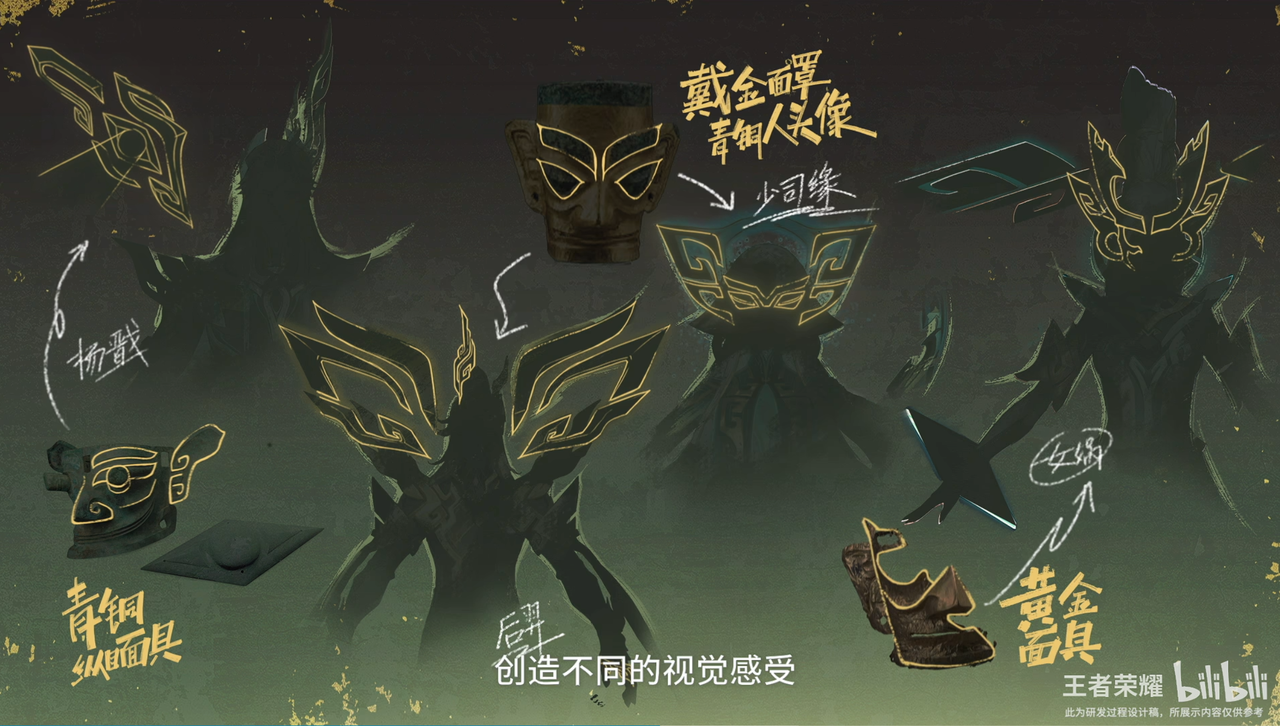 首先,为了满足玩家对于联动皮肤最简单直白的需求——美观,团队将三星堆传播度最高的面具作为一种通用的元素提取出来,并将其转化成一种设计美学,融入在了各个皮肤的细节当中。