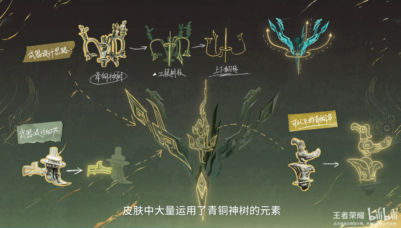 具体到皮肤设计上,从三星堆文化中提炼的文物元素,并不是以大面积凸显青铜的方式呈现,而是将青铜作为镶嵌,配合着琉璃、翡翠等多种材质的混搭,从而营造一种视觉上的“层次感”。