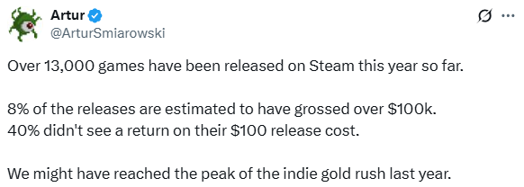 正如开发者Artur所言:“我们可能去年已经达到了独立游戏淘金热的顶峰。”当淘金者数量远超金矿存量时,多数人只能空手而归。
