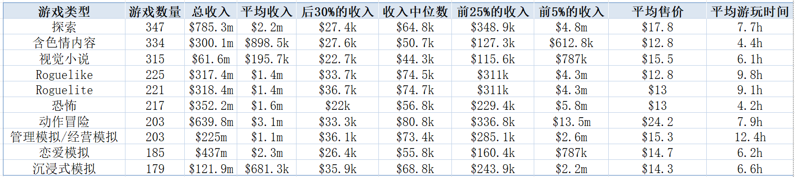 再者就是,根据开发者Artur分享的另一数据,我们发现收入突破1万美元的游戏,如探索类(347款)、色情内容类(334款)和视觉小说类(315款),占据了收入版图的绝大部分。
