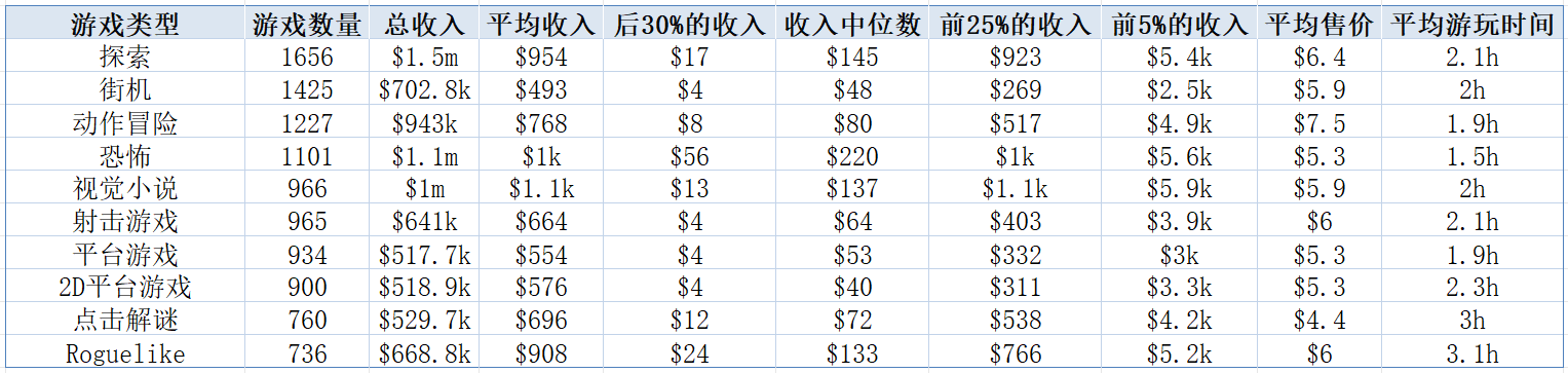 而收入低于1万美元的游戏中,探索类(1656款)、街机类(1425款)和动作冒险类(1227款)在数量上遥遥领先,构成了市场的基底。