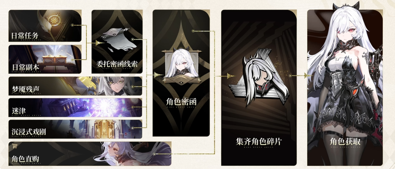 角色与武器的免费获取途径主要围绕“密函系统”展开——获取密函线索,线索合成密函,完成密函委托后抽取碎片,最终合出完整的角色或武器。